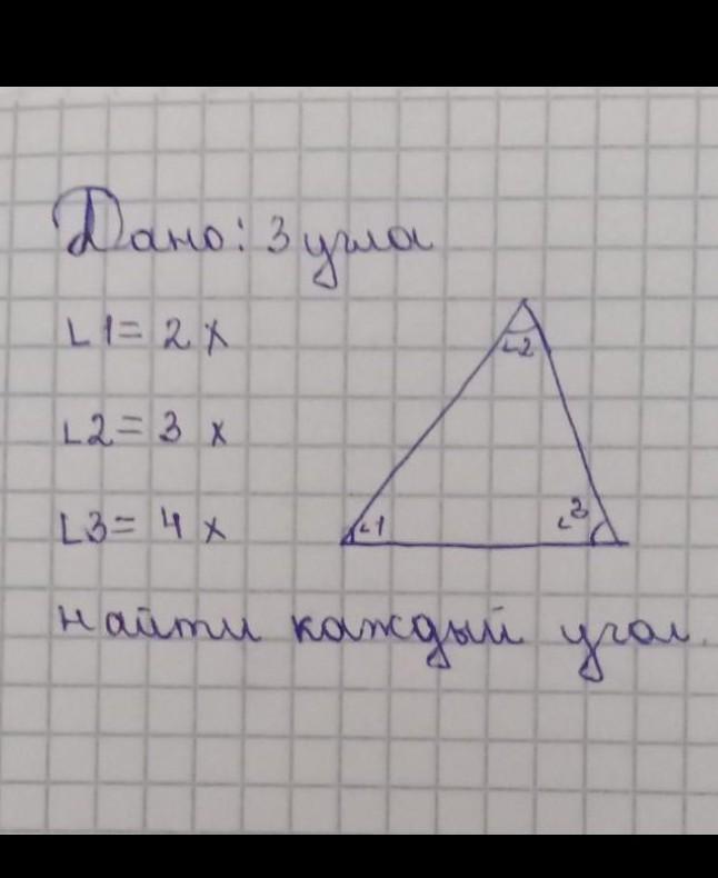 Угол 1 = 2х, угол 2 = 3х, угол 3 = 4х.