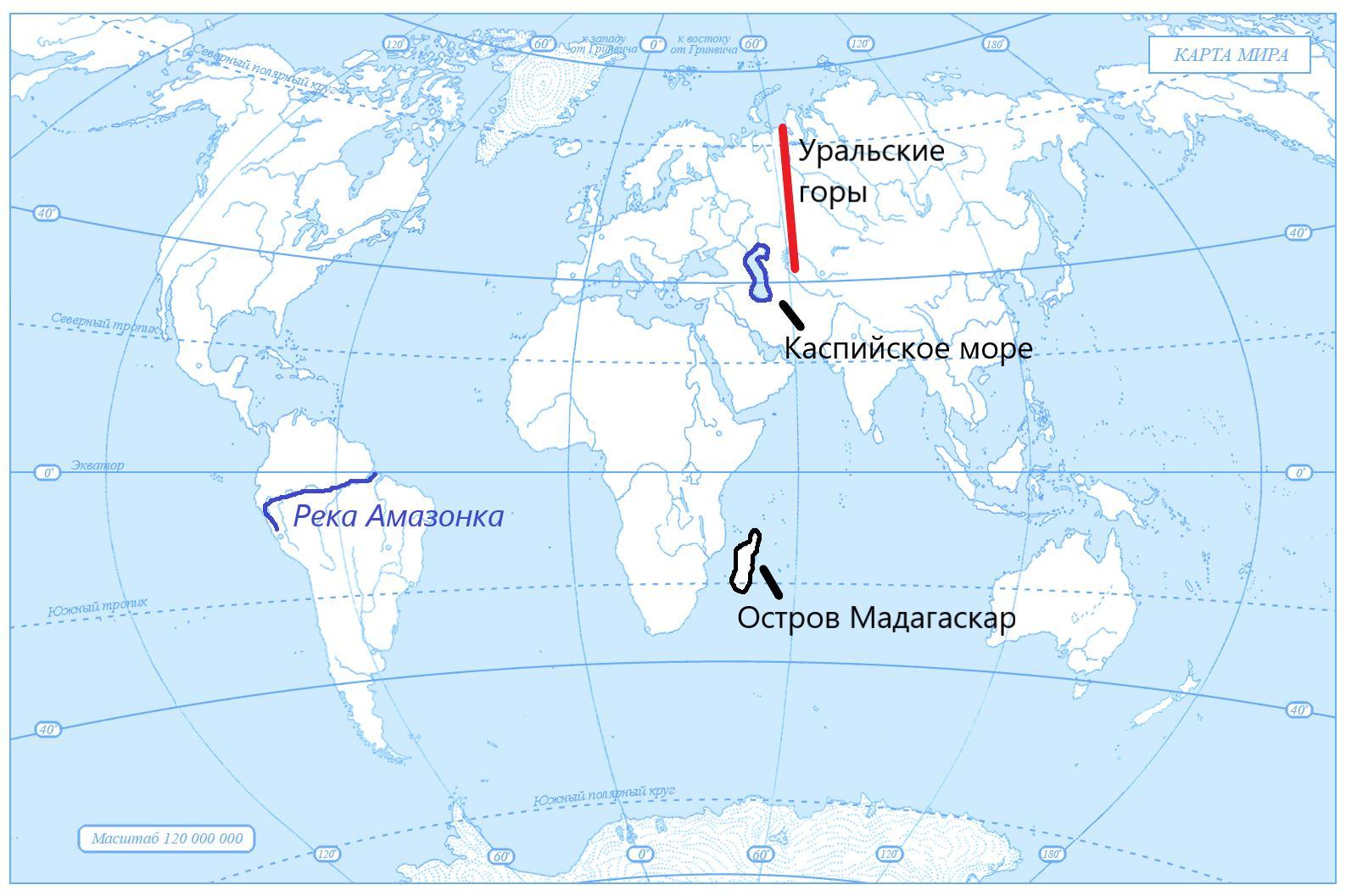 Остров Мадагаскар, Каспийское море, Уральские горы, реку Амазонку Пожалуйста срочно умоляю.