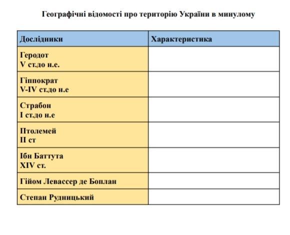 На этой странице сайта, в категории География размещен ответ на вопрос Заповніть таблицюДаю 45 балов?. По уровню сложности вопрос рассчитан на учащихся 5 - 9 классов. Чтобы получить дополнительную информацию по интересующей теме, воспользуйтесь автоматическим поиском в этой же категории, чтобы ознакомиться с ответами на похожие вопросы. В верхней части страницы расположена кнопка, с помощью которой можно сформулировать новый вопрос, который наиболее полно отвечает критериям поиска. Удобный интерфейс позволяет обсудить интересующую тему с посетителями в комментариях.